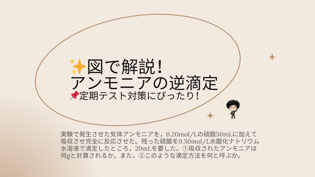 実験で発生させた気体アンモニアを,0.20mol/Lの硫酸50mLに加えて吸収させ完全に反応させた。残った硫酸を0.50mol/L水酸化ナトリウム水溶液で滴定したところ,20mLを要した。①吸収されたアンモニアは何gと計算されるか。また,②このような滴定方法を何と呼ぶか。
