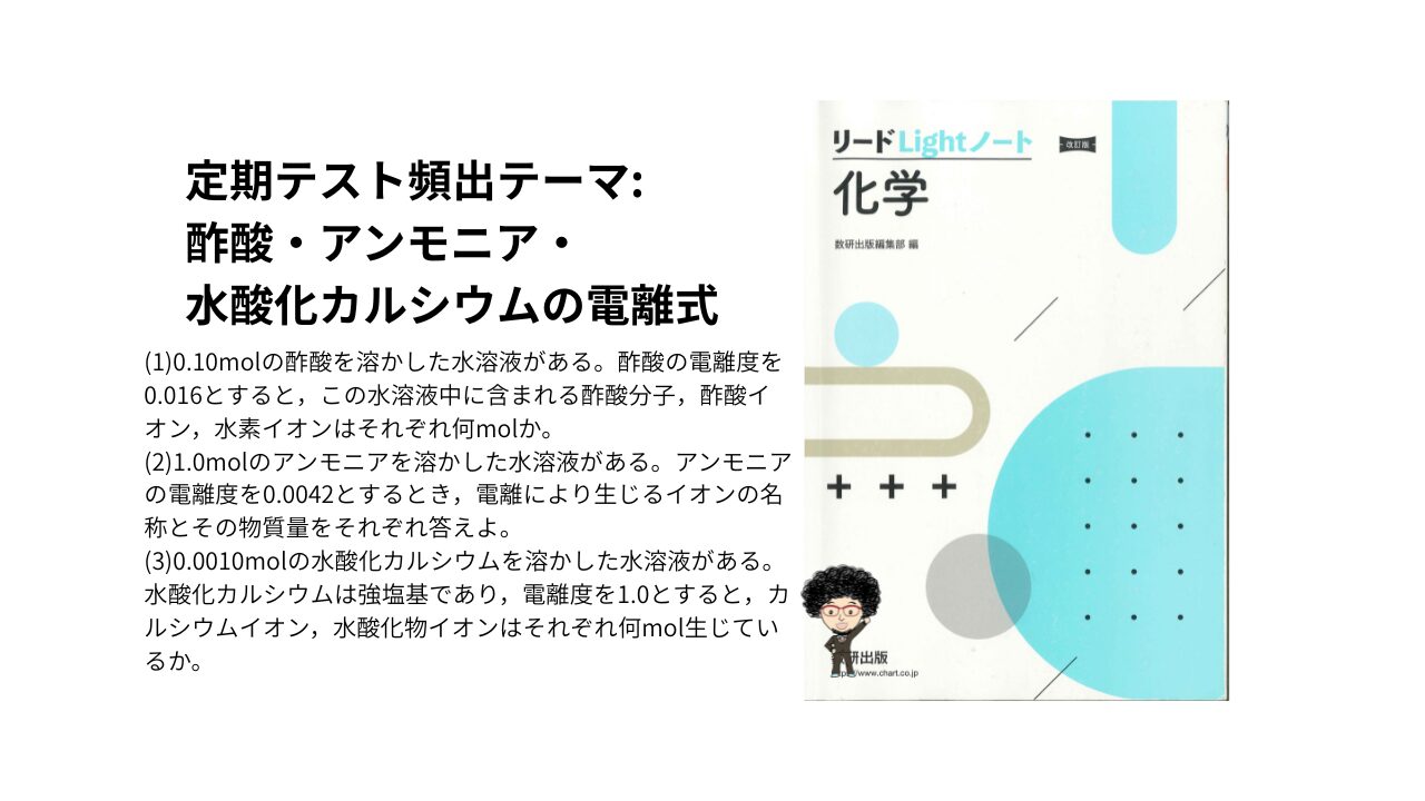 💡「リードLight化学基礎から出題!定期テスト頻出テーマ:酢酸・アンモニア・水酸化カルシウムの電離式」