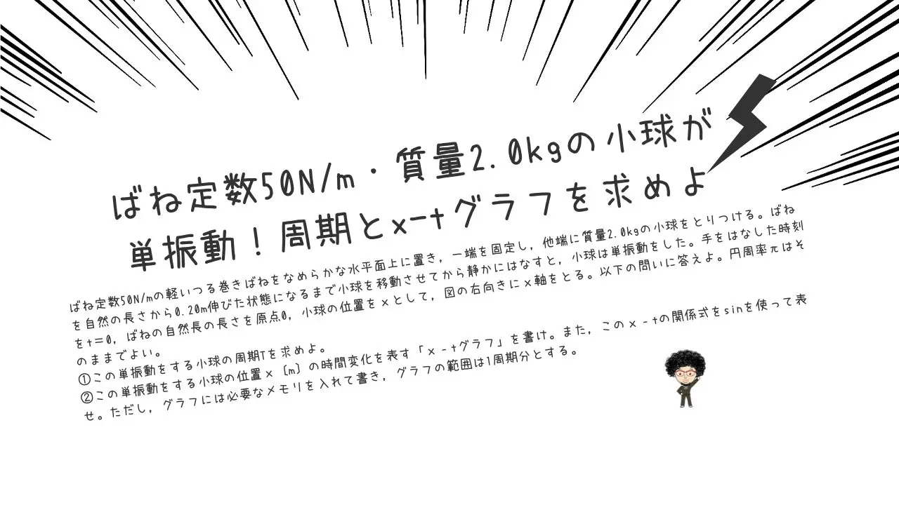 🔍ばね定数50N/m・質量2.0kgの小球が単振動!周期とx-tグラフを求めよ